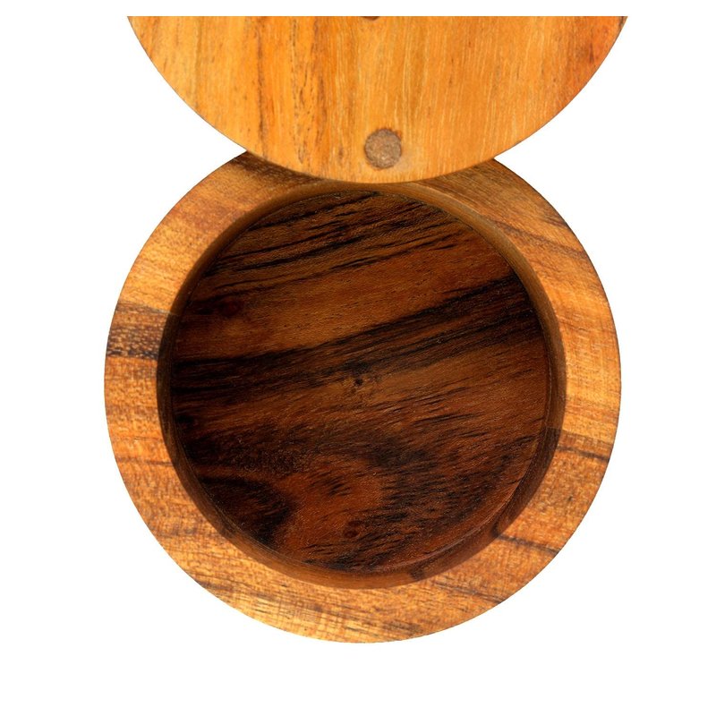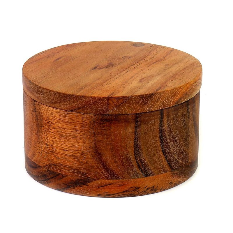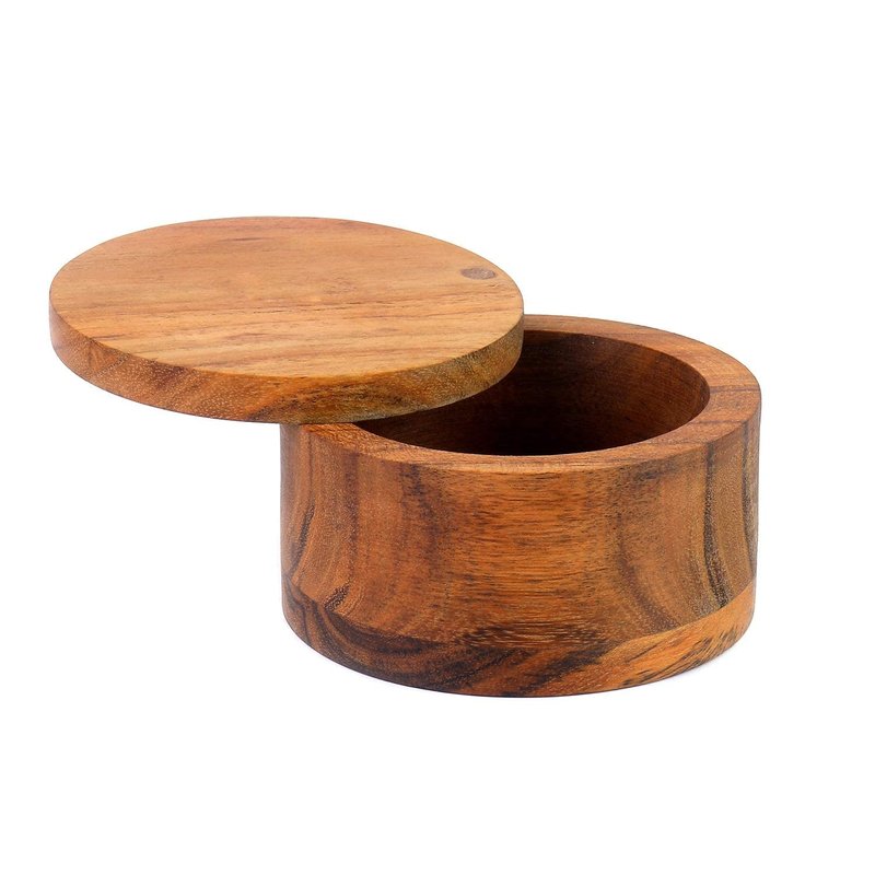 Kaizen Casa Acacia Wood Salt or Spice Box with Swivel Cover perfect for keeping table salt, gourmet salts, herbs or favorite seasonings, close at hand on your countertop.