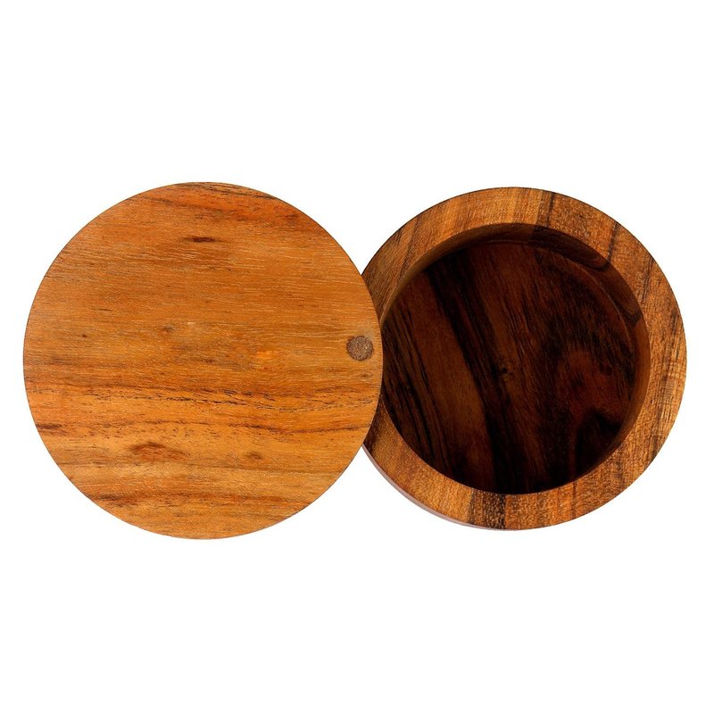Keep spices stylishly stored with this Acacia Salt Box with Swivel Cover. Crafted of solid acacia wood, it is noted for its durability, sustainability, and gorgeous wood grain. The unique swivel cover allows easy access but offers protection when not in use. Perfect for storing specialty salts, spices or even small household items.