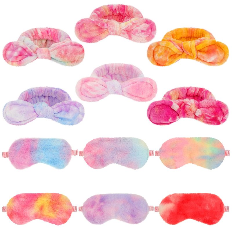 Kajaia 12 Pcs Sleepover Party Favors for Teenager Girl Plush Bow Headbands Tie Dyed Sleep Eye Mask Elastic Hairband Soft Eye Shade for Single Women Pajama Spa Party Supplies Bag Stuffer