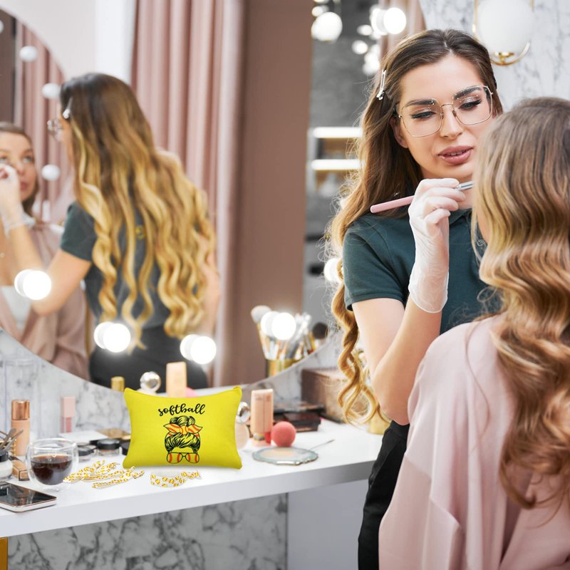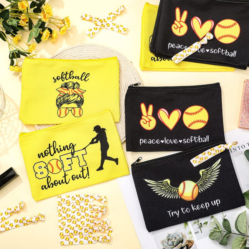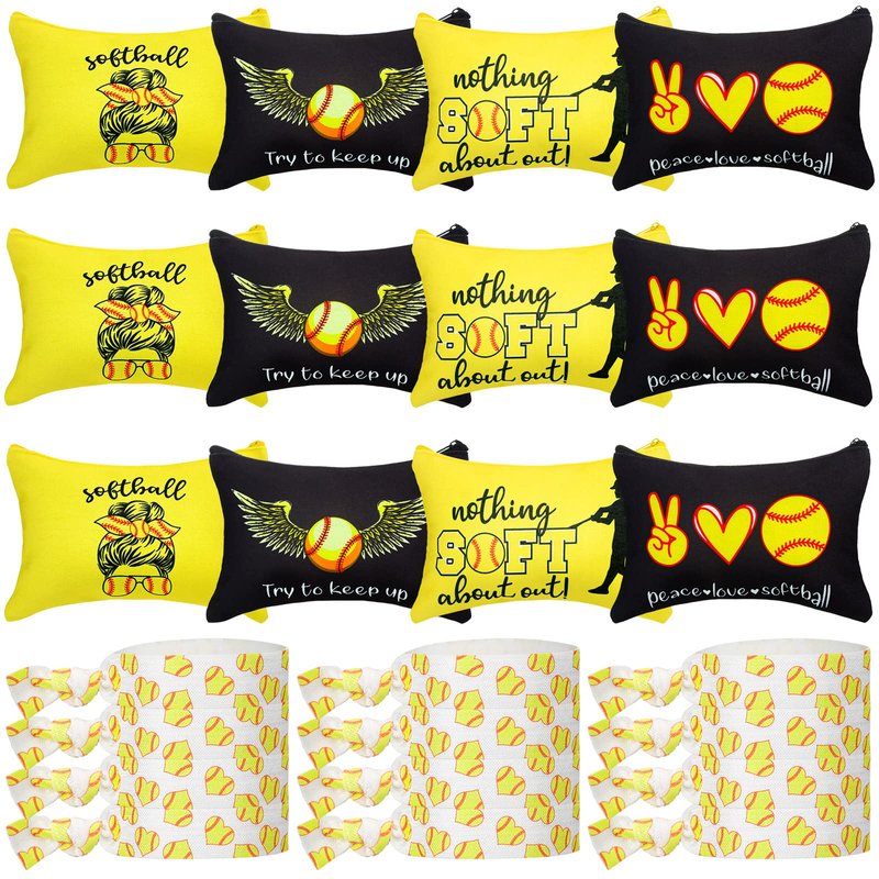 Features: Hold various accessories: The sport cosmetic bag can help you hold a variety of accessories, such as lipsticks, makeup brushes, keys, foundations, eye shadows, pens, rulers, and other delicate things, considerate zipper design, easy to open and close, keep items secure without mess or loss. Ideal for multiple hairstyles: The softball headbands have smooth surfaces, simple to wear, hard to hurt your hair or scalp, convenient for you to get different hairstyles, such as braids, ponytails and buns. Specifications: Material: Softball makeup bags: canvasSoftball hair scrunchies: silk satinMain color: black, yellowSize: Softball makeup bags: about 20 x 13 cm/ 7.87 x 5.12 inchesSoftball hair scrunchies: about 11 cm/ 4.33 inches in outer diameterPackage includes: 12 x Softball makeup bags12 x Softball hair scrunchiesNotes: Manual measurement, please allow slight errors on size. The color may exist a slight difference due to different screen displays.