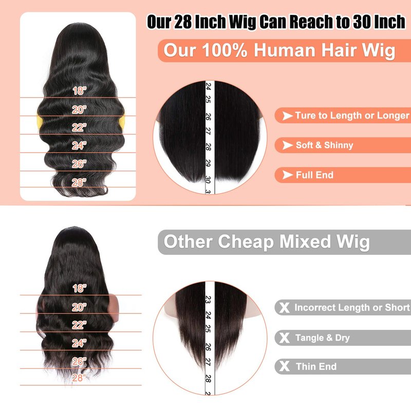 - Body wave lace front wigs human hair; Elastic and breathable wig cap, medium size(22-22.5 Inch), 2 adjustable straps with 4 combs inside. Easy to install and adjust. True to length, measure it from top to end, Our 28 Inch Wig Can Reach to 30 Inch Easily.