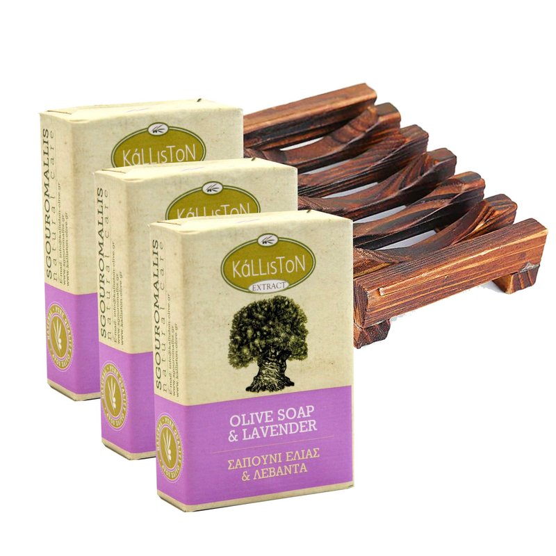 Kalliston, Sensitive and Dry Skin Soap Collection, Made in Ancient Crete, Greece, Pack of 3 with Soap Dish (Lavender)