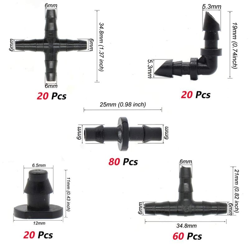 - ❀PACKAGE INCLUDES:This 200-pieces barb connector kit includes: 80 x straight barbs,60 x tube tees , 20 x elbows fittings, 20 x end plug, 20 x 4-way coupling. Meet all the needs of garden irrigation parts.