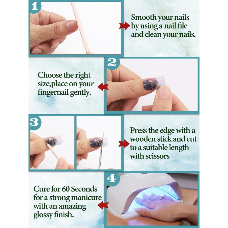 - Easy to Use: The gel nail wrap stickers are easy to put on, file down, and cure by UV light. You can get salon-quality nail art in just a few minutes. Removal is also quite easy, peel them off with a wooden stick or fingers.