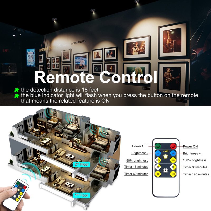 - [Battery Operated & Remote Controlled] - The painting light is wireless and powered by 3 AA batteries (not included). Long lasting super bright LED, 80 Lumens, 3000K warm white, no additional wire is needed. The remote can control the lights within 18 ft, very handy and easy to operate.