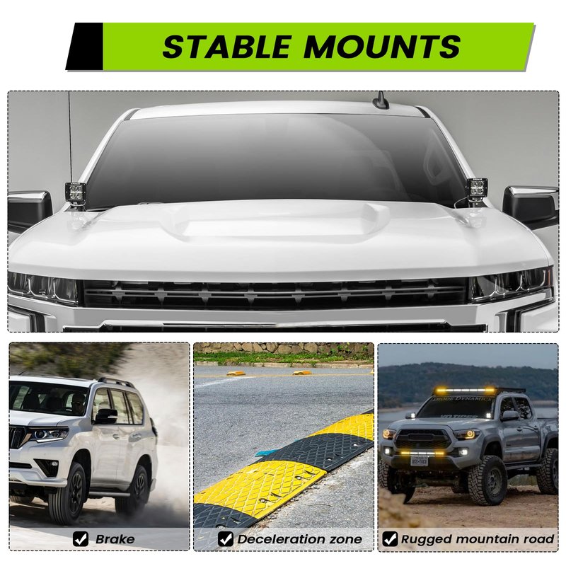 - 【Low-Profile design】The LED pods brackets will sit low on your hood, will not block your driving view or affect the opening or closing of the hood.