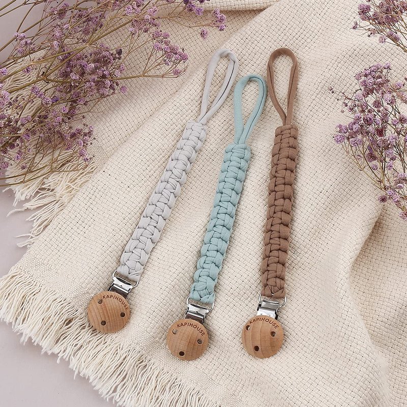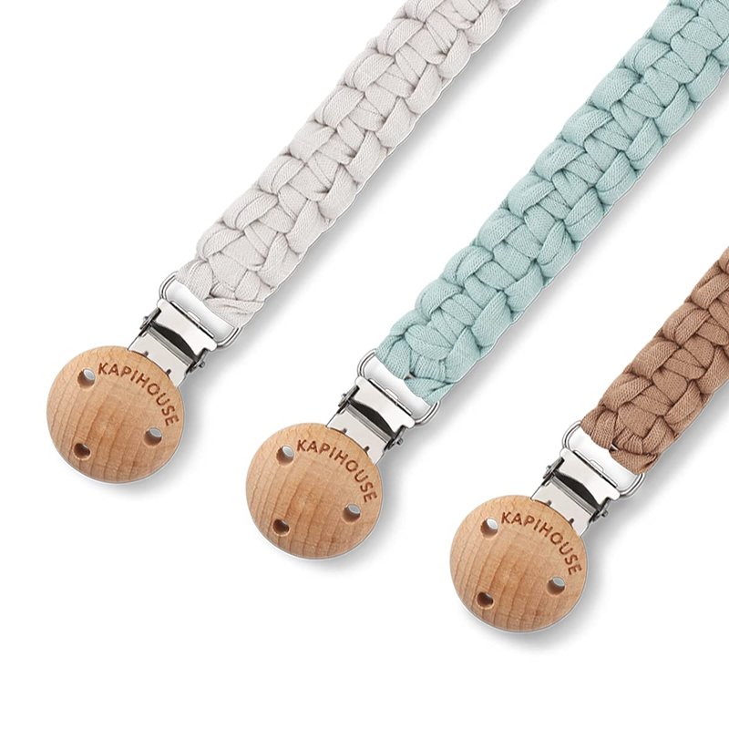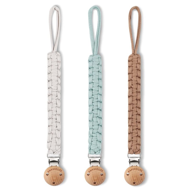 Never Make the Pacifiers to Dropping on the Dirty Floor Anymore! Kapihouse Pacifier Clip Help Your Life Easily and Make Your Babies Keep Smile!Product Details: Material: cotton braided rope and woodern clip Ingredient: BPA Free, Phthalate Free, Latex Free, Lead Free, Non-toxic Total length: 9.2 inch Color:green,brown,grey Packaging includes: 3Pcs Pacifier Clips Why to choose our pacifier clip: Soft, gentle, comfortable and safe to babies Sturdy and durable clip on clothes without tearing clothes 100% safe and non-toxic, No chocking Keep the pacifier or toy don't lose and clean Easily wash it with soapy water and then air dry, no rusting after long time use 3 different colors and modern design perfect for girls and boys Works with universal pacifiers, teething toys or soothie A cute gift for your cute babies, they will love these pacifier clips Risk-free Warranty 60 DAYS replacement and refund warranty offered. Welcome to contact us when you meet any questions.
