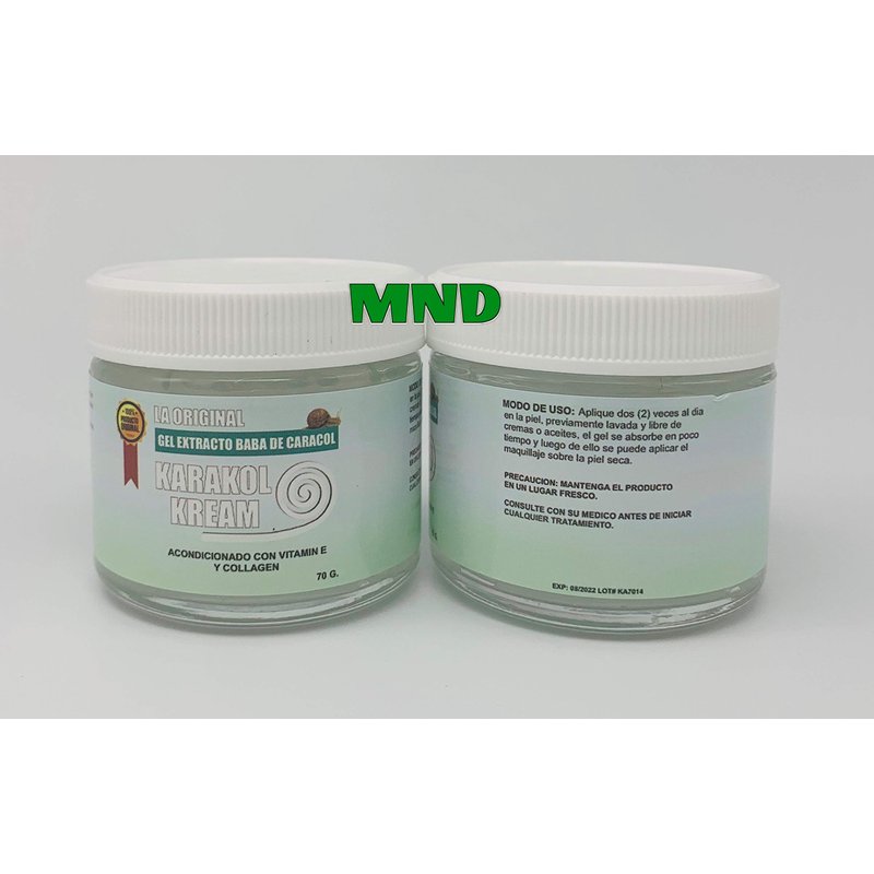 OU RECEIVE 1 BOTTLE OF KARAKOL KREAM Crema Especial Antiarrugas. La Baba de Caracol tiene extraodinarias propiedades regenerativas*. Ayuda en problemas con manchas, acné, cicatrices y arrugas. La Alantoina y Colágeno activos en la crema actuan en la piuel regenerando los tejidos. El ácido Glicolico ayuda en un peeling de las células muertas. About the product Expression Lines Scars Wrinkles Freckles burns stains on the skin and Striations