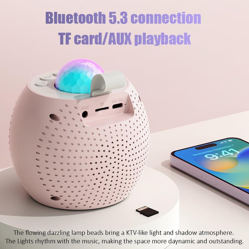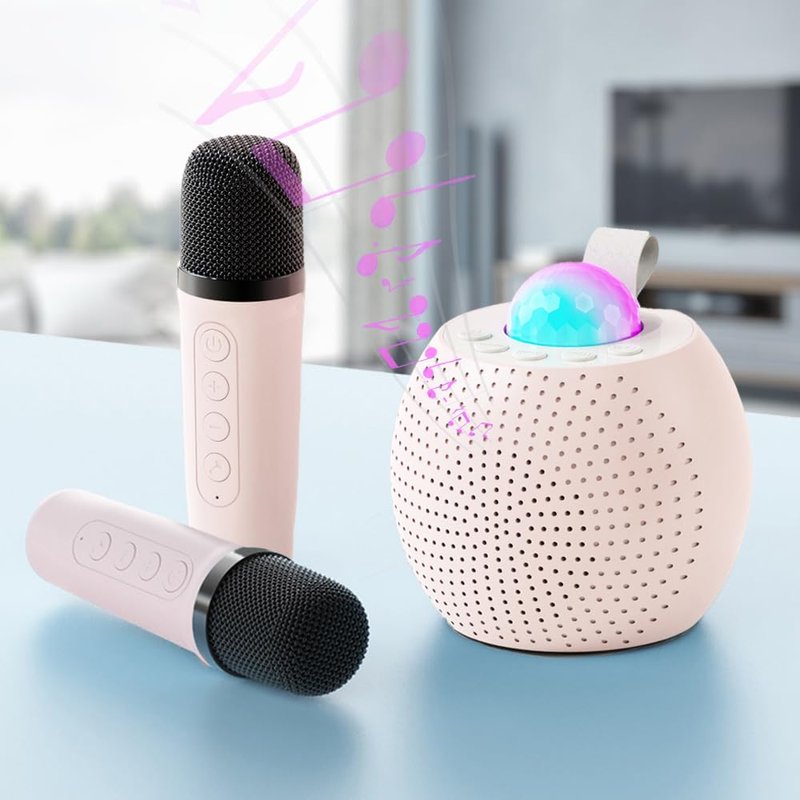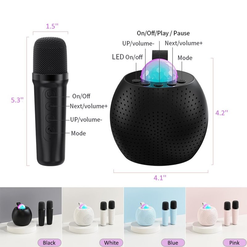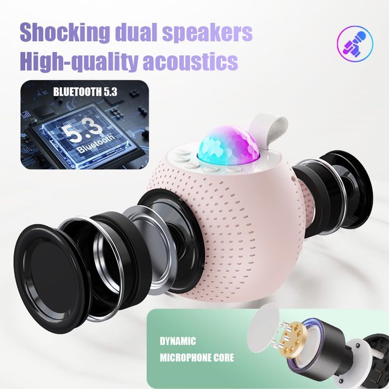 - 【Multi-Colored LED Light Show】The mini karaoke machine come with a built-in LED light show, they can transform any room into a concert hall. The top of the kids karaoke machine is equipped with a disco ball light, and the RGB Light can project onto the ceiling and walls to create a dreamy night for kids. It is a great night light for kids room decoration.The portable speaker with microphone turns the dark room into a fascinating world, suitable for girls, baby boys gifts, room decoration.
