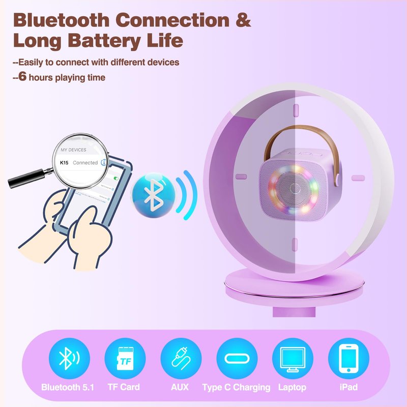 - 8H Playback Time & Mini Portable Size: Experience extended playtime with up to 6-10 hours per charge. The karaoke machine for kids is compact and lightweight, bluetooth speaker and wireless microphone are all hand-size designed, which making it easy for children to hold and singing. It's an ideal kids toys for birthday Christmas party at home, classroom, family, outdoor activities, and more