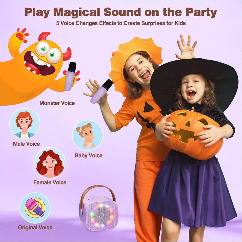 - Magic Voice Change & Vibrant Light Effects: This wireless karaoke microphone come with 5 kinds of magic voices, including girl's, boy's, baby's, monster's and the original sound. The dynamic multi-color light bring a new level of excitement to your party show. The voice-changing effects and LED lights encourage creative expression and imaginative play, allowing kids to explore and experiment with different sounds and visual effects
