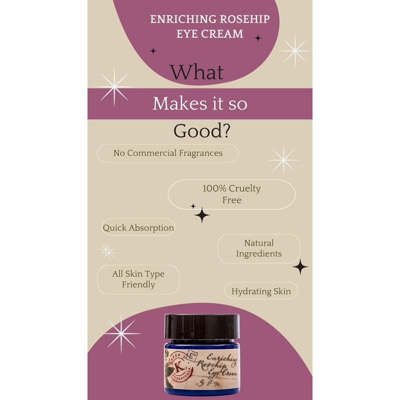 Enriching Rosehip Eye Cream Discover the soothing benefits of our Enriching Rosehip Eye Cream, specially crafted to provide gentle care for the delicate skin around the eyes, mouth, and neck. This eye cream offers a luxurious and nourishing experience. Formulated with thoughtfully selected ingredients, our Enriching Rosehip Eye Cream includes Rosehip Seed oil and organic Cocoa Butter to support and enhance this moisturizer. Additionally, Borage Seed and Evening Primrose Oils contribute gamma-linolenic acid, promoting the production of a smooth and beautiful complexion; organic Sea Buckthorn Oil adds countless skincare benefits.