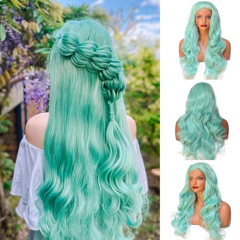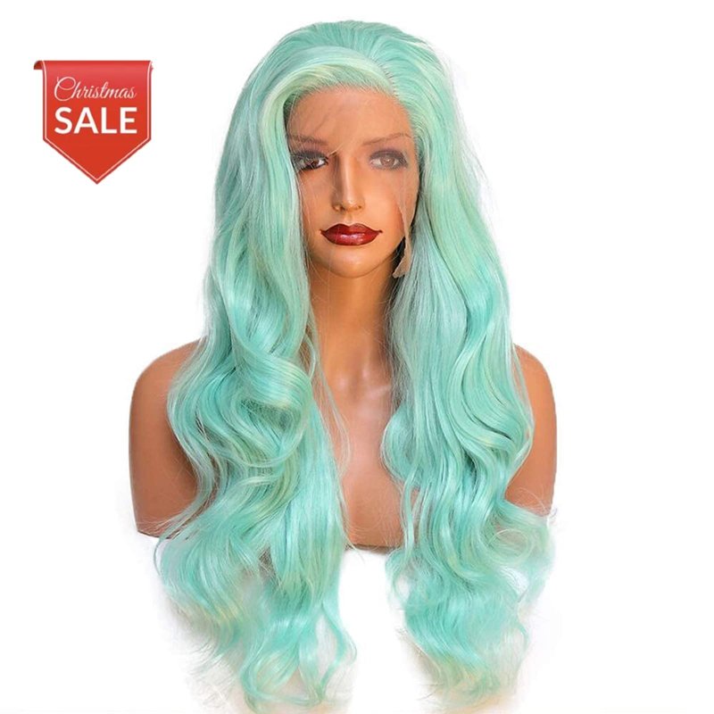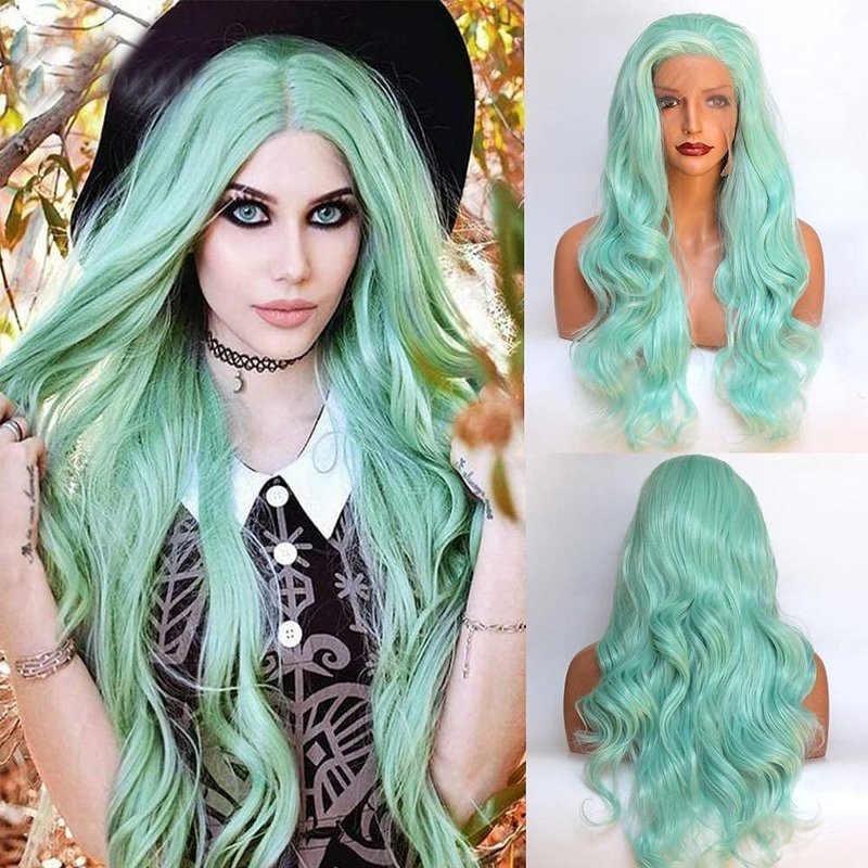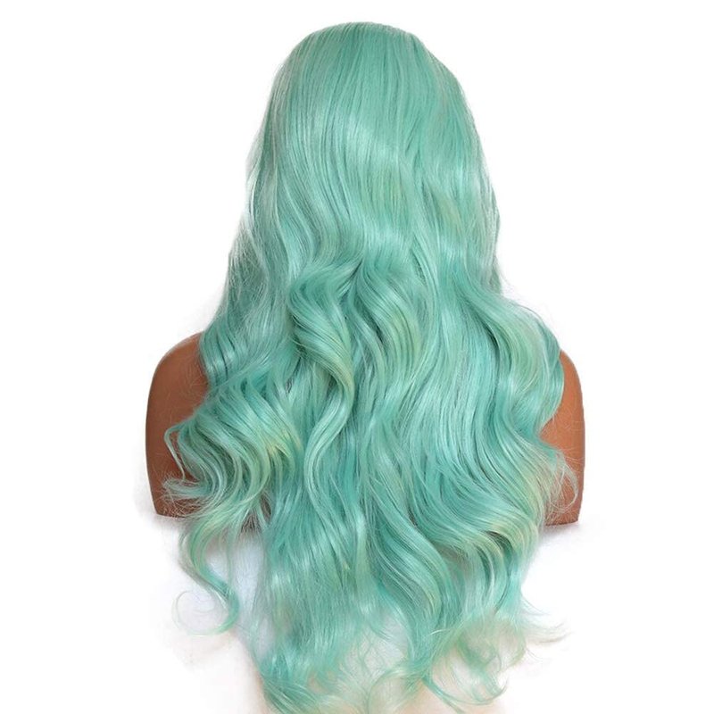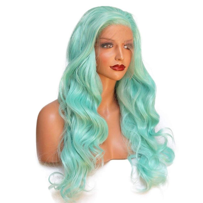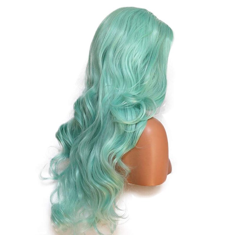 - Basic Info of Green Synthetic Lace Front Wigs: 24 inches Long Wavy Bright Blue Wig Mint Lace Front Synthetic Wigs , Half Hand Tied Lace Front Wig with Lace 2.5 Inches Parting Space in Front.High Quality Swiss Lace, Strong and Soft, Never Hurt Skin. (Default lace color is midium brown, Kind Reminder: Slightly Color Difference between Different Monitors)