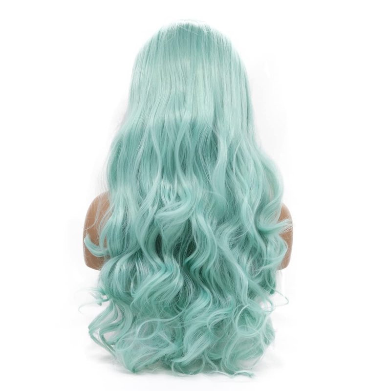 - Basic Info of Green Synthetic Lace Front Wigs: 24 inches Long Wavy Mint Lace Front Synthetic Wigs , Half Hand Tied Lace Front Wig with Lace 2.5 Inches Parting Space in Front.High Quality Swiss Lace, Strong and Soft, Never Hurt Skin. (Default lace color is midium brown, Kind Reminder: Slightly Color Difference between Different Monitors)