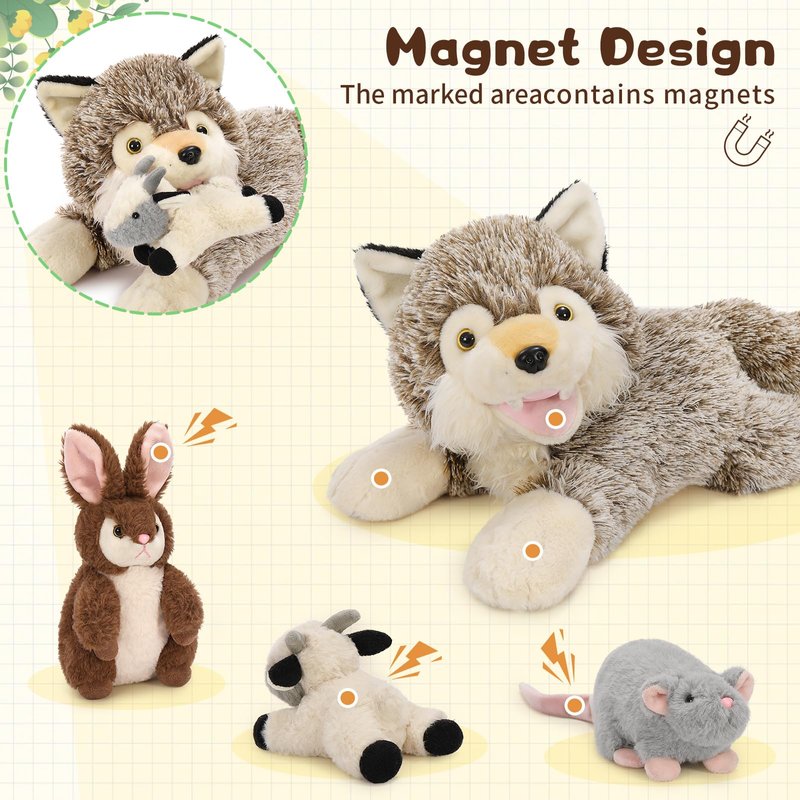 Karister 4Pcs Wolf Stuffed Animals, 20" Magnetic Wolf Plush with Bunny Goat Mice in Giant Coyote's Zippered Belly, Christmas Birthday for Boys Girls Kids, Wildlife Party Decor