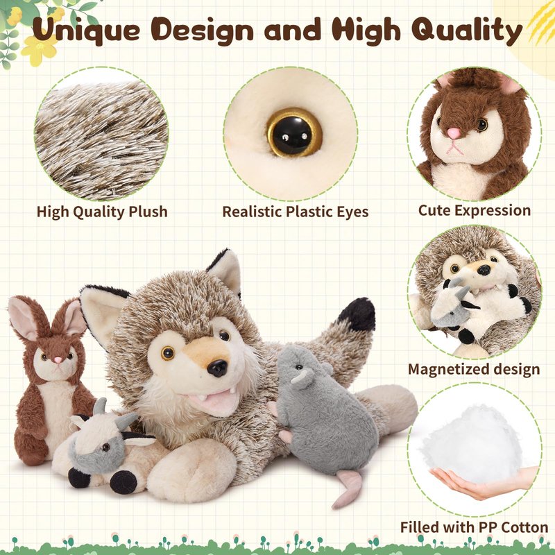 - Interactive Wolf Stuffed Toys: We've also hidden other surprises on this doll's body. We designed a zipper pocket on the wolf's belly, your kids can easily take out or put back the other 3 critters. It helps kids to know more animals and also helps to develop the habit of cleaning up the toys after playing.