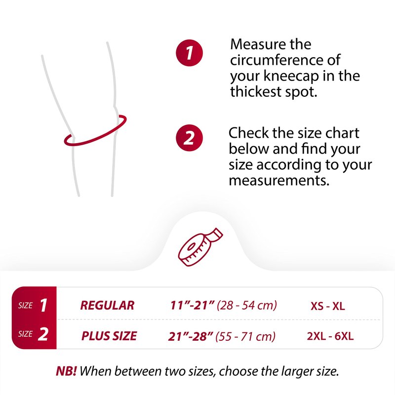 - Before adding the plus-size single patella knee strap to the shopping cart, make sure this size is meant for you by following the size chart displayed in the photos section of the product page. Plus size strap is for you if the measurement from the thickest part of your knee cap is between 55 - 71 cm. If you need help, reach out for personal assistance and we will get back to you within 24 hours.