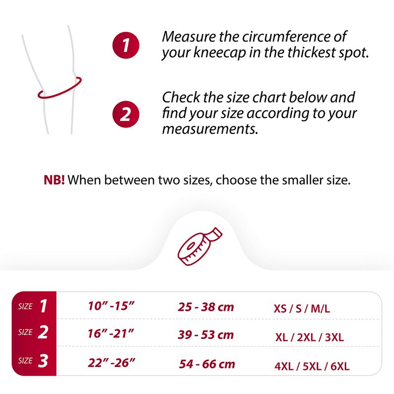 - Follow the size chart. Size 2 is for you if the circumference of your kneecap from the thickest part is between 16-21 inches / 39-53 cm.