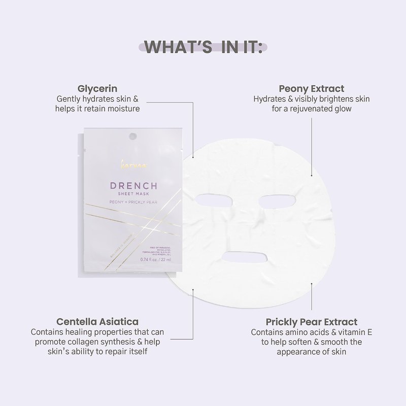 - Maintain Your Natural Glow - Infusing DRENCH vegan face mask sheets with Peony enriches it with Vitamin E & antioxidants. These powerful nutrients fortify each sheet face mask with enhancing properties that unveil your skin’s natural radiance from within.