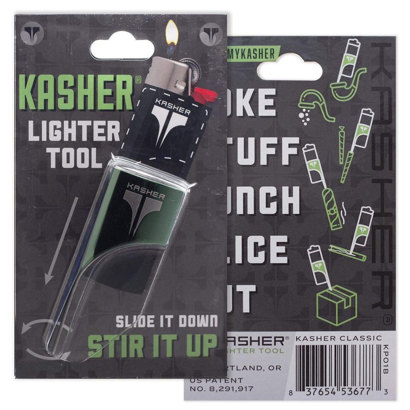- KASHER LIGHTER TOOL - It’s a solid metal lighter accessory made to fit snugly on any lighter. It is crafted to significantly to increase the functionality of a lighter by helping in a variety of tasks that require a strong, blunt, and small tool