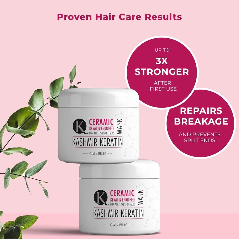 kashmir Keratin Ceramic Hair Mask deeply conditions dry, damaged hair, repairs with keratin, making it soft, frizz-free, hydrated, well-conditioned, and adds shine. (8 oz).