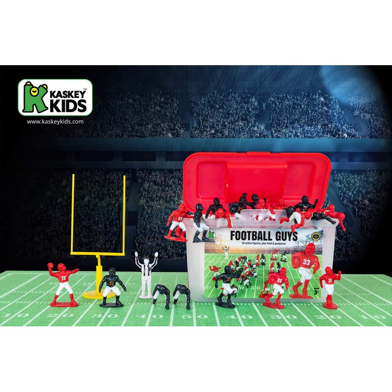 Football Guys will inspire hours of creative, open ended play in sports loving kids ages 3 and above. With no set rules or directions, children are inspired to play with these sports figures the way they have been playing with action figures for years, by using their imagination. As soon as kids set up the 24 Guys, referee, felt field and goal posts that come packed in the convenient carry case, they control the action and will be engaged for hours. Kids can recreate professional football games they have seen or youth games they have played in. Youth football coaches and professional analysts use Football Guys as a training tool and visual aid to describe plays and game day scenarios. Parents can use football guys to teach the young football fan in their own family about the rules of the game and inspire a love of football early on. The party planner in any family can use Football Guys as a Football themed centerpiece or simply use the GUYS as cake and cupcake toppers. Research shows open-ended play with no defined expectations or rules is beneficial to a child's social, emotional, and cognitive development which is exactly what Football Guys was created to inspire. Kids can even add to the play value by bringing other toys into the fun; add cars to make a parking lot, use blocks to build a stadium, or set up other figures as spectators. Kaskey Kids was founded by a mother of four who was in search of sport-themed toys that would keep her children entertained and inspired. The sets have won numerous Toy Industry awards and have been featured by national publications. If kids love sports and love playing with action figures this is the perfect toy to add to the playroom. Ages 3 years old and above.