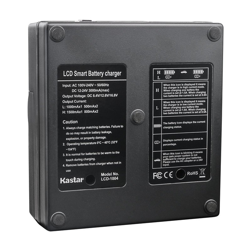 - Intelligent Dual Fast charger LCD displays charging status, battery capacity, it can charge two batteries at the same time, change different plate, suitable for most of digital batteries.