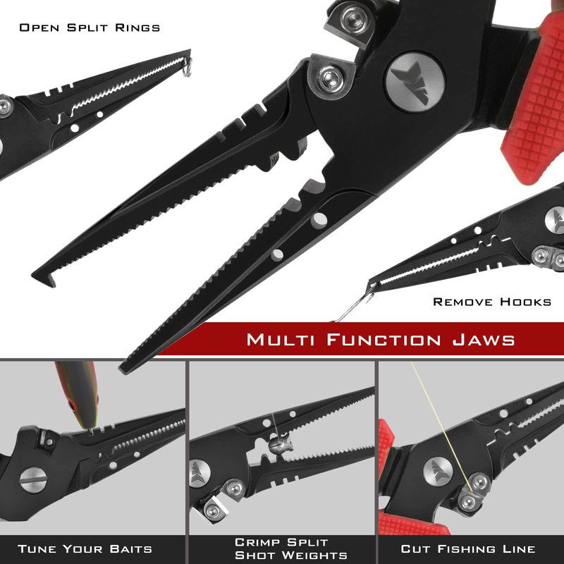 - Multi-Function Jaws – Grab and remove any fishhook with the serrated jaws or take advantage of the crimping slots to secure a split shot weight or build a steel leader. To cinch down a knot quickly and safely, insert your hook into one of the holes in the jaws and pull on your hook to create a tight knot. Available in both a straight nose and a split ring nose design.