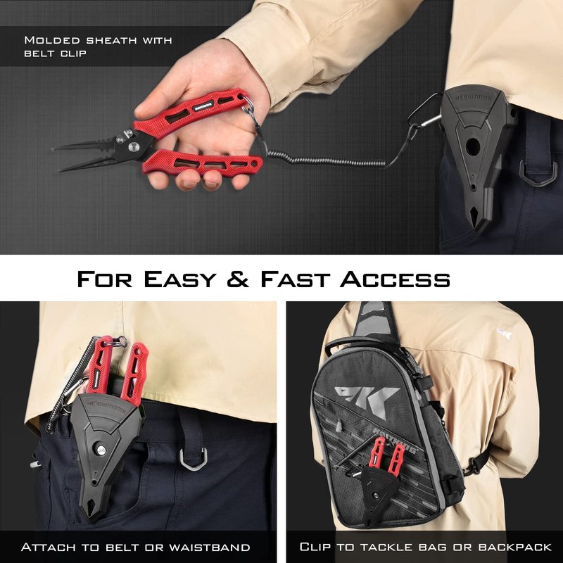 - Sheath/Lanyard Included – Includes a custom molded sheath with belt clip to ensure your investment is protected from normal wear and tear. Clip on to your belt or the waistband of your shorts, to make sure you have quick access when a fish is on the line and the coiled lanyard will ensure your fishing pliers don’t fall overboard!