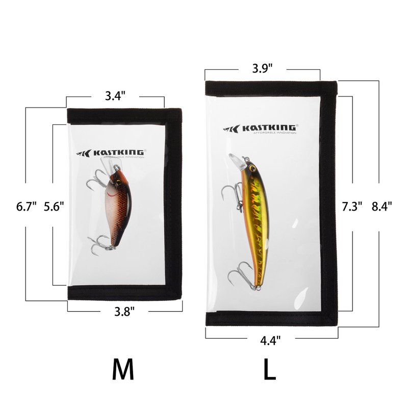 - Available In Two Popular Sizes for Most Lures – KastKing MadBite Lure Wraps come packed 4 lure wraps per package and are available in two sizes. The large PVC window size is 7.48” x 3.89” and the small PVC window size is 5.67” x 3.38” when folded and attached to your rod.