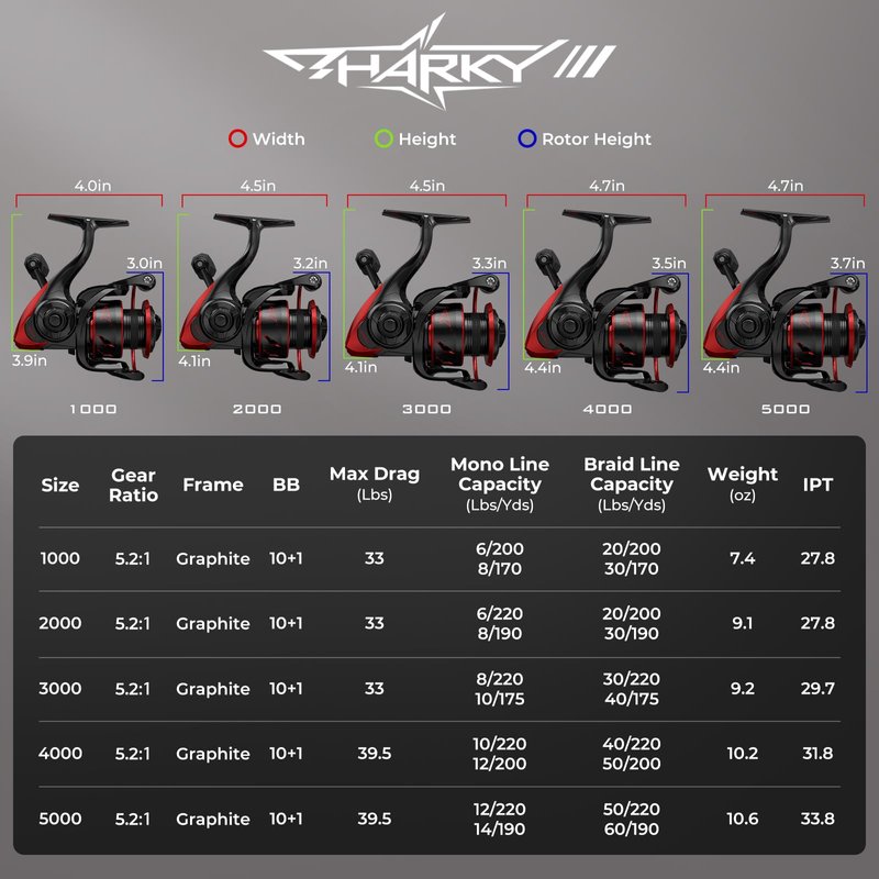 - PURE POWER - You will love Sharky III spinning reel's amazing best-in-class up to 39.5LBs / 18KG of smooth, reliable triple disc carbon fiber drag, oversized stainless-steel main shaft, and stronger precision mesh manganese brass pinion gears.