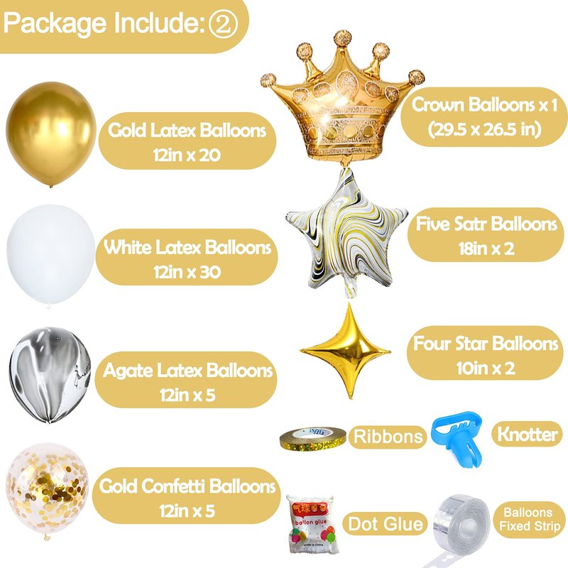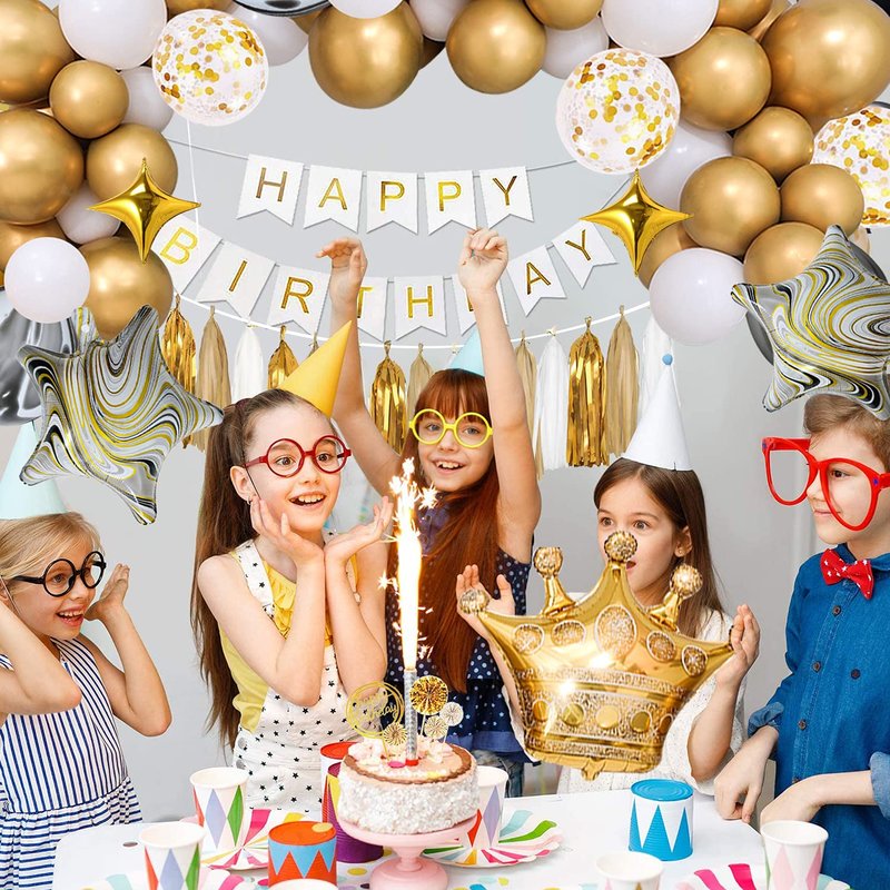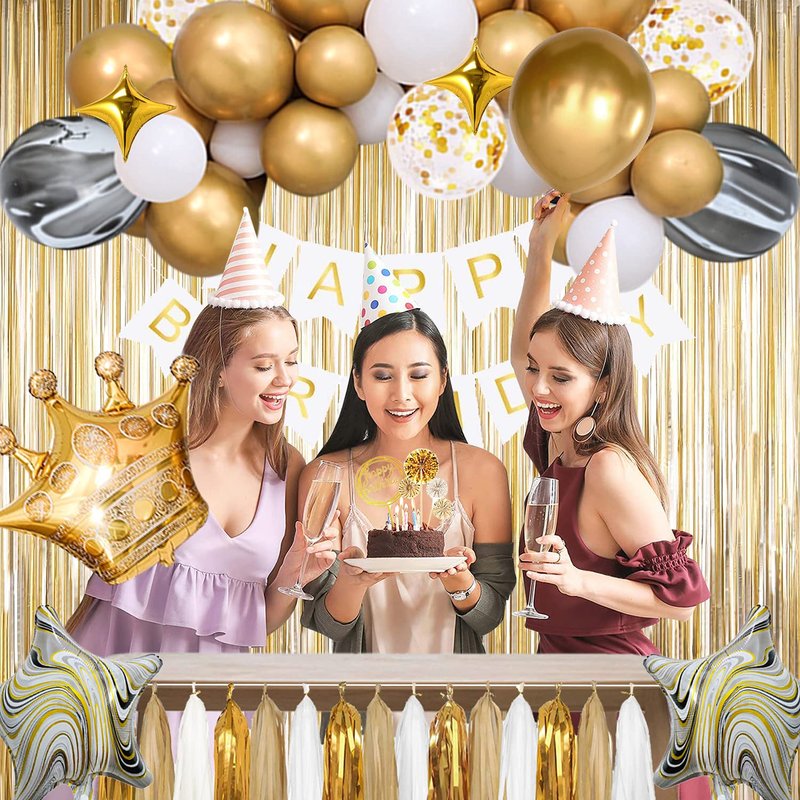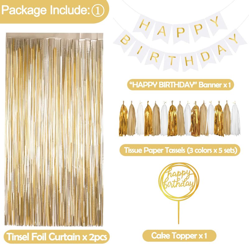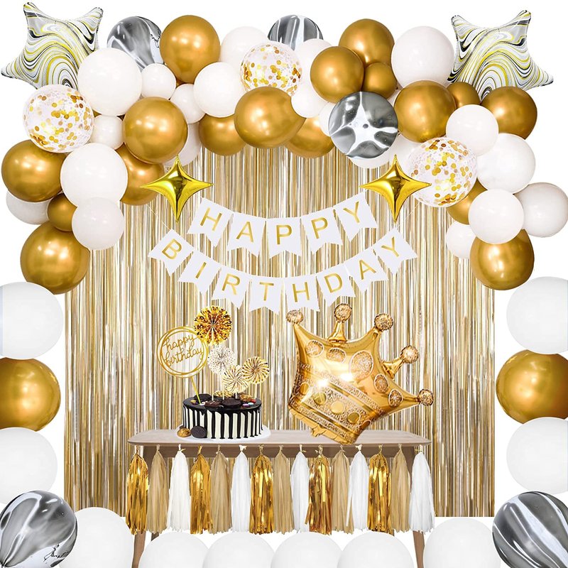 - COMPLETE GOLD BIRTHDAY DECORATIONS SET - This happy birthday decorations pack includes 1 Gold White Happy Birthday Banner, 2 Metallic Tinsel Foil Fringe Curtains (6.53.3ft), 1 Crown Balloon (2.52.2ft), 15 Tassel Ribbons in 3 Colors, 2 Gold Four Star Foil Balloons, 2 Five Star Agate Foil Balloons, 30 White Latex Balloons, 20 Gold Latex Balloons, 5 Gold Confetti Balloons, 5 Black Agate Balloons, and 1 Happy Birthday Cake Topper.