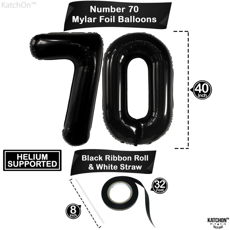 - GIANT SIZE 40 INCH | LUXURIOUS BLACK 70 BALLOON : Celebrating your 70th Birthday Balloons or anniversary? This giant Black Number 70 Balloon is 40 inch in size and ideal for 70th birthday decorations for women decor, 70 year old birthday decorations, and 70th anniversary. It comes with 8 inch white straw and 32 ft ribbon roll. Perfect happy 70th birthday balloons for your 70 birthday decorations for men.