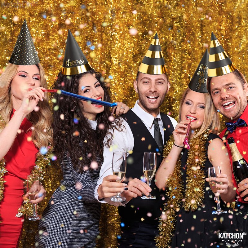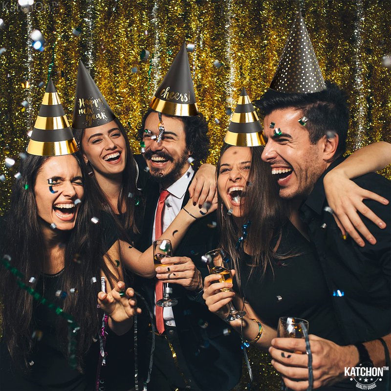 KatchOn, Happy New Years Eve Party Hats - Pack of 4 | Black and Gold New Years Eve Hats, New Years Eve Party Supplies 2024 | New Years Hats for NYE Decorations 2024 | Happy New Years Decorations 2024