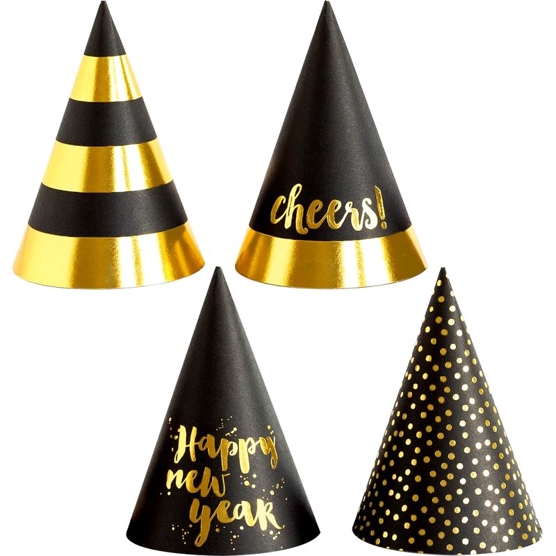- BIG PACK OF 4 | NEW YEAR HATS 2024 : Are you looking for a stylish NYE hats party that would best match fit for your new years decorations? These New years eve party hats 2024 is pack of 4, Made with high quality Card stock. The new years hats 2024 feature a cute and exquisite appearance to bring you more fun. These new years party hats are foldable to avoid the damage during transportation. Complete your Happy New Years Decorations 2024 with style using our elegant black cone party hat.