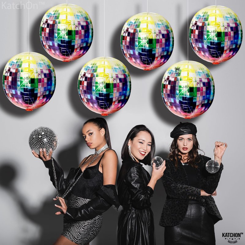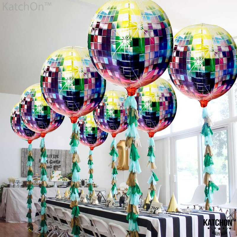 - JUMBO SIZE - 22 INCH | PACK OF 6, DISCO BALL BALLOONS: Add some retro flair to your disco party decorations with our katchon jumbo disco ball balloons! Measuring 22 inches in diameter, these 80 s theme party decorations are perfect for creating a groovy atmosphere on the dance floor. Hang them with 80s theme balloons from the ceiling for maximum impact. Reflective surfaces will catch the light, createing dazzling displays for 90's party decorations, 70 s party decorations for adults.