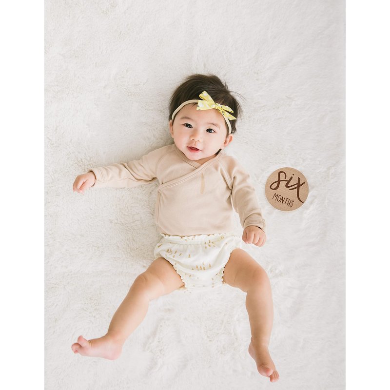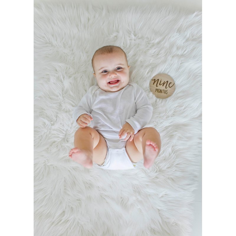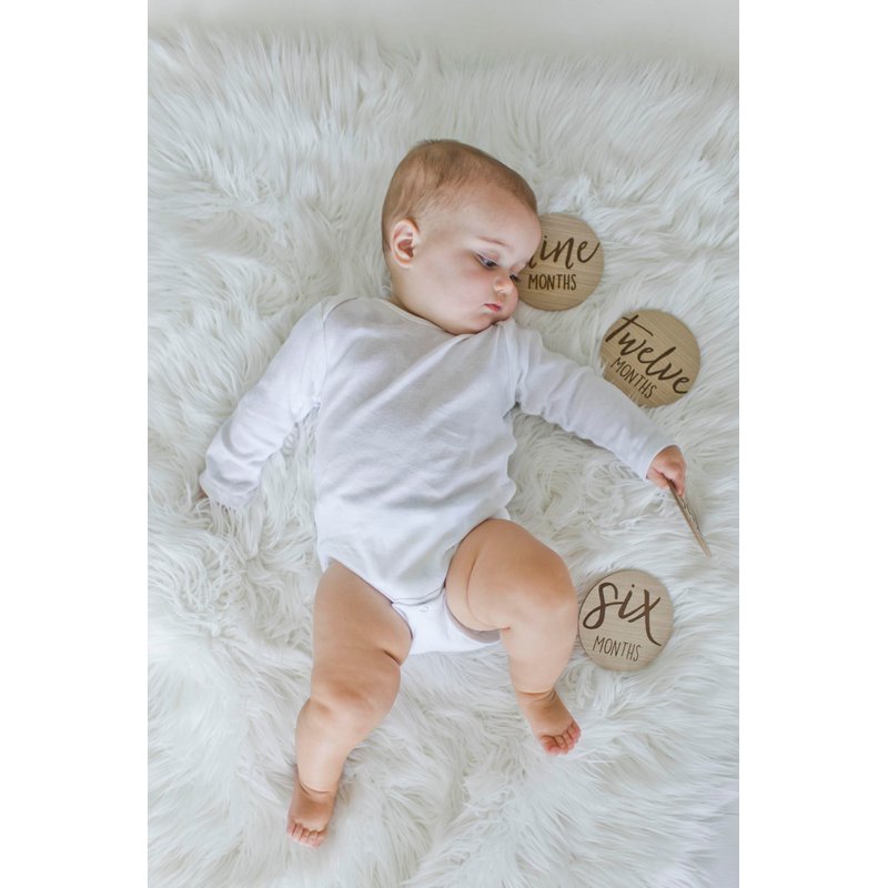 - 6 Double Sided Photo Props: Includes six 2-sided circular beige wooden baby milestone props for capturing each month of baby’s first year from one month to twelve months in contrasting dark brown letters to make the words pop and stand out