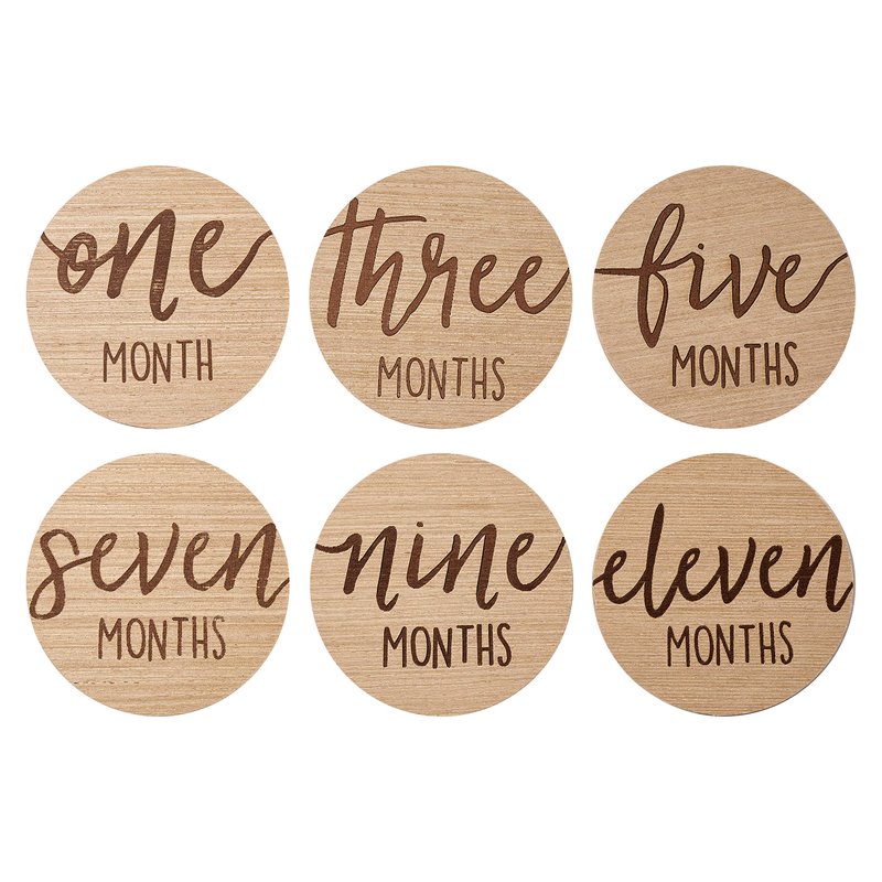 - Wooden Newborn Milestone Discs: Our milestone cards are lasered on high-quality MDF wood making these smooth and durable, made to last. Each milestone card measures 4" H x 4" W; Includes 6 reversible cards