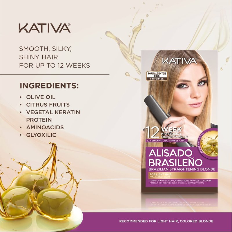 Kativa Brazilian Straightening Blonde Kit, 12 Weeks of Home Use Professional Straightening, with Olive Oil, Citrus Fruits and Keratin, for Straighter, Softer and Shinier Light-Coloured Hair