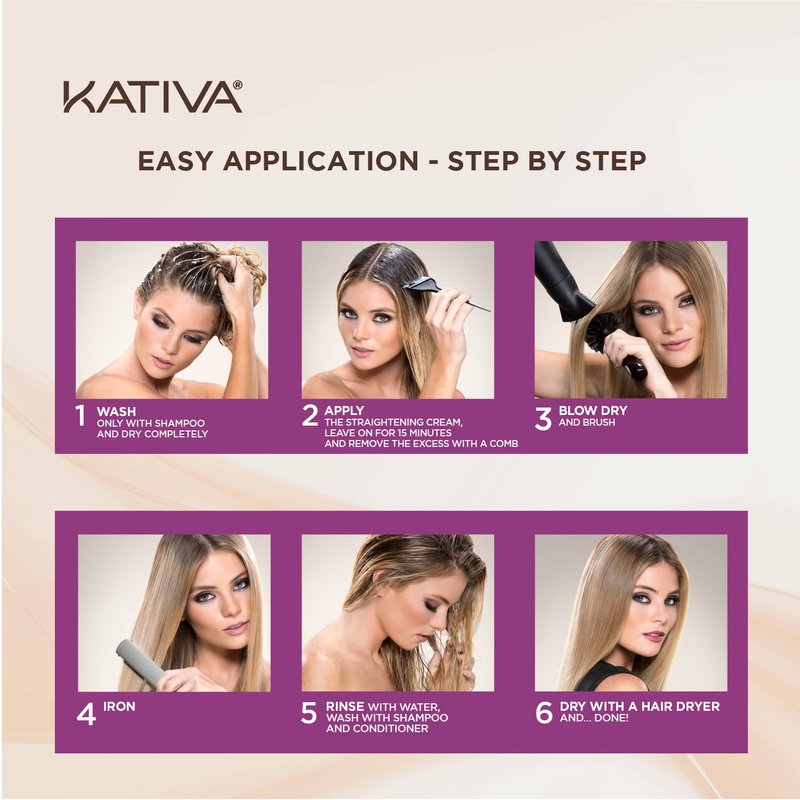 "With the Kativa Brazilian Straightening Blonde Kit experience straighter, softer and shinier hair with natural movement. The kit straightens hair with curls, waves, volume and frizz. It also recovers strength, shine, hydration and softness. Expect professional result for up to 12 weeks. You can rely on the effective and safe formula that provides care. With thermo-protection and thermic memory: straightening is activated with blow dryer's heat. This straightening treatment is recommended for light-coloured hair, but check out one of Kativa's other Brazilian Straightening Kits if this isn't the right hair color for you. Its straightening formula with Glyoxylic, Vegetal Keratin and Amino Acids does not harm or modify the hair fiber's structure and is complemented by Olive Oil's hydrating action and Citrus Fruits' anti-oxydant power, to leave hair straight, with natural movement, soft and shiny. This product is recommended for light hair: dark blonde, blonde and light blonde (color depths 6, 7 and 8) and for hair with color designs such as balayage, highlights and illumination, among others. This kit includes: Pre Treatment Shampoo x 15 mL Straightening Mask x 150 mL Shampoo x 30 mL Conditioner x 30 mL Brush Pair of gloves Step by step leaflet"