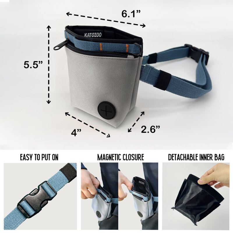 - EASY TO USE: KATOZOO pouch is designed to fit your everyday use when training your pets. It features a magnetic closure, allowing quick and one-handed access to your pet's favorite treats. A built-in poop bag dispenser for messier occasions. And a front zipper pocket to secure personal items! Our pouch also comes with a training clicker to supercharge the training session. Using positive conditioning to your advantage for better training results.
