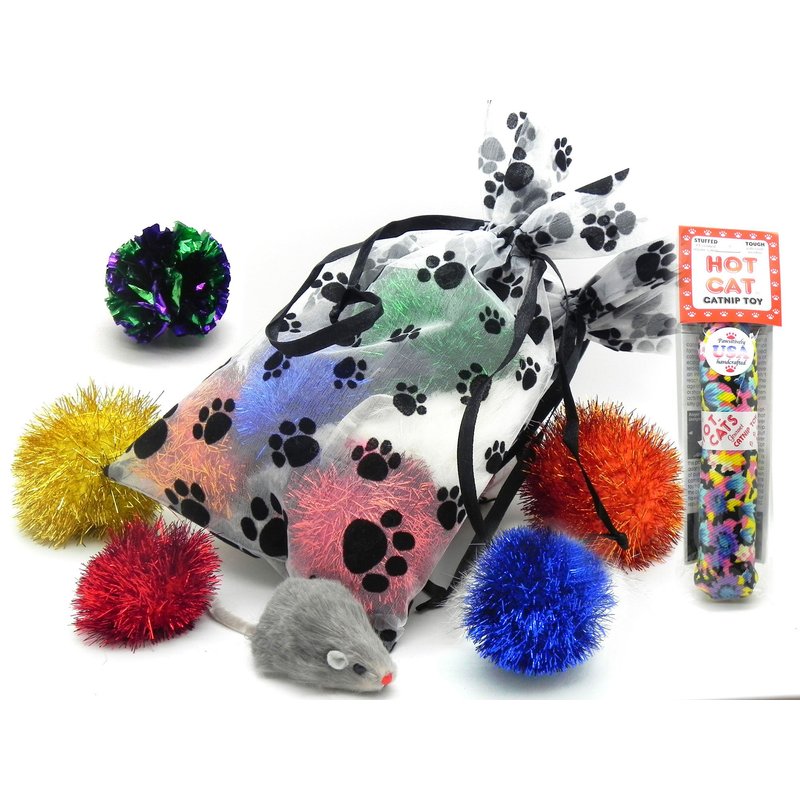Need an idea for that special cat lover? what about a special gift for your favorite cat? These cute paw print fabric bags are stuffed with our most popular cat toys.