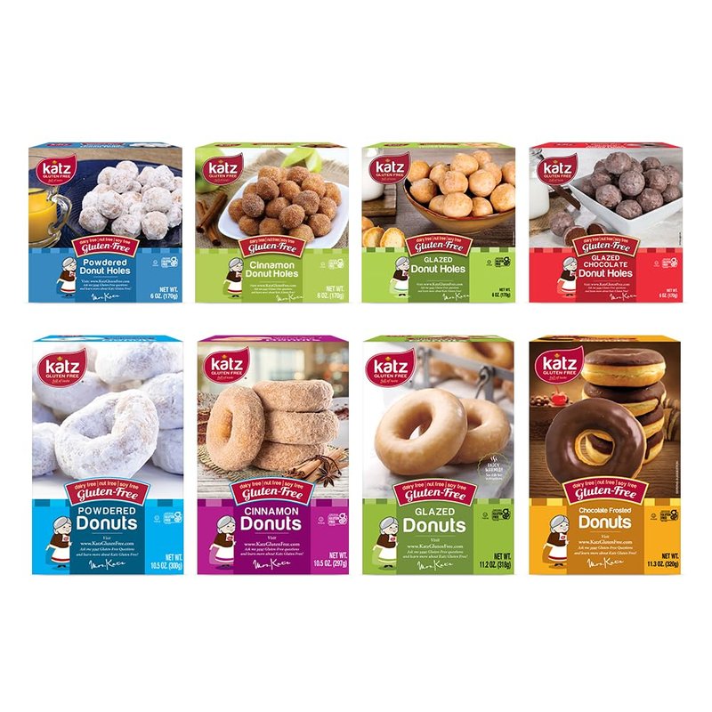 Katz Gluten Free Donuts & Donut Holes Top 8 Flavors Variety Pack | Gluten Free, Dairy Free, Soy Free, Nut Free | Powdered, Glazed, Cinnamon, Glazed Chocolate | Kosher (1 Pack of each, 8 Total))
