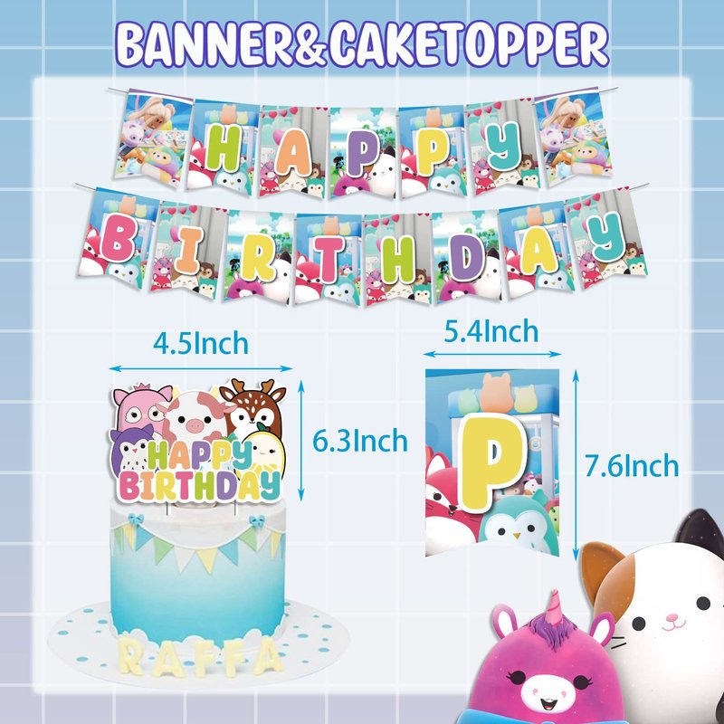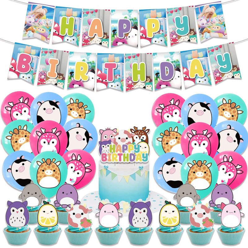 Kawaii Birthday Party Decorations Pack Plush Toys Themed Party Supplies for Girls Boys Kids Includes Banner Balloons Cake Cupcake Toppers