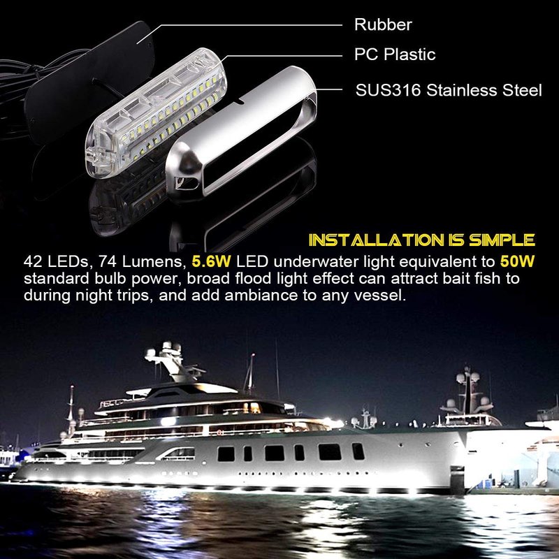 - 【High Brightness】: 42LED Boat Interior Lights, come with 4.8ft wire harness, 450Lumens, 5.6W LED underwater light equivalent to 50W standard bulb power, broad flood light effect can attract bait fish to during night trips, and add ambiance to any vessel.