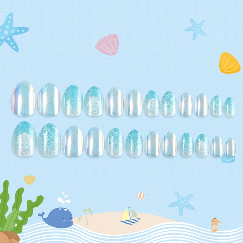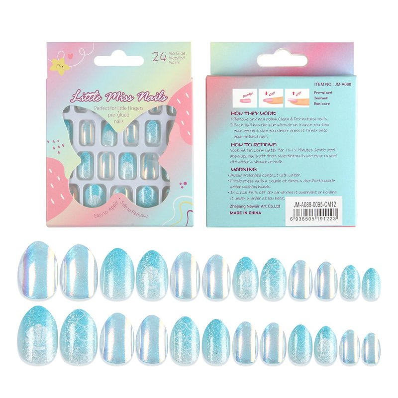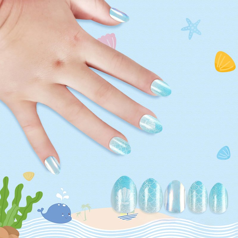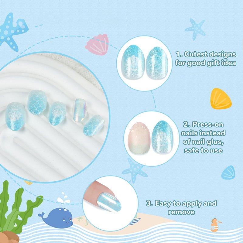 Kawyehu Kids Press on Nails Short Almond Children Fake Nails Artificial Nail Tips Adhesive Full Cover Short False Fingernails for Girls Kids Nail Decoration (Shine Ocean Party)