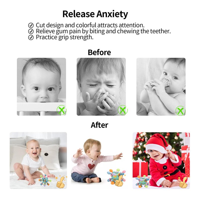 - 【Baby Teething Toys】 The teething toys for babies consisted of 12 colorful silicon teether, two 360 rotation transparent ball into the toy and rattles toys, which produces a soft rattling sound and encourages grasping. Shaking slightly will make a rustle and sound a pleasant bell to attract the baby's attention.