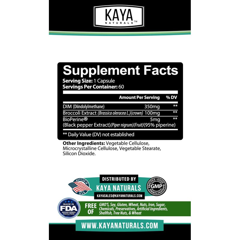 HORMONE SUPPORT SUPPLEMENT: Enjoy the nutritive boost of cruciform vegetable extracts. Our Kaya Naturals DIM Ultra is an herbal supplement for women and men that supports the body's hormone balance using 455mg of Diindolylmethane (DIM) and other botanicals. It helps your body optimize estrogen and testosterone to promote balanced hormone levels. You can get natural support for hormone-related challenges such as acne, signs of menopause, and prostate health. NATURAL PLANT EXTRACTS: Our vegetable capsules are formulated with natural botanical extracts from cruciform greens. Get the added boost to your hormone functions with broccoli extract and BioPerine, a patented black pepper extract with at least 95% piperine. BioPerine also facilitates other added benefits that keep you fit and trim overall. Our DIM supplement encourages the right conditions for enhanced nutrient absorption. Together with balanced meals and proper rest, it can help you increase your energy levels and overall health. Our estrogen and testosterone supplement for men and women also provides increased antioxidant defense. You can enjoy enhanced protection from potentially damaging oxidative stress caused by free radicals. QUALITY SUPPLEMENTS YOU CAN TRUST: We make it a point to use the highest quality ingredients when making our products. We want you to succeed in becoming the healthiest you can be. Remember that sensible meals, regular exercise, and plenty of good sleep help you get the most out of your diet supplements. For best results, make it a regular part of your daily health regimen! Just take 1 capsule twice a day, 20-30 minutes before meals or as directed by your healthcare provider. Get your Kaya Naturals DIM Ultra today and get started on the road to a happier, healthier you!