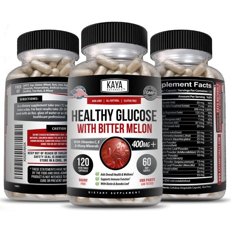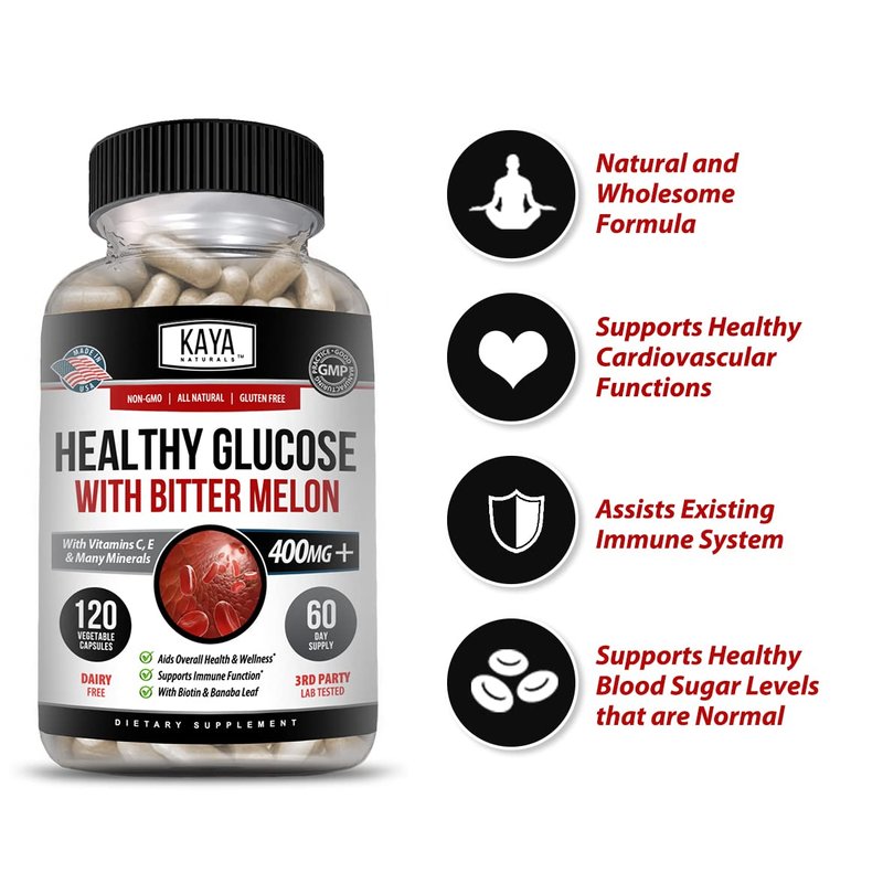 Kaya Naturals Healthy Glucose with Bitter Melon Supplement Support Healthy Levels & Function, 20 Herbs Vitamins Minerals, Alpha Lipoic Acid, Cinnamon, Vitamin C & E Gluten Free, Non-GMO - 120 Caps