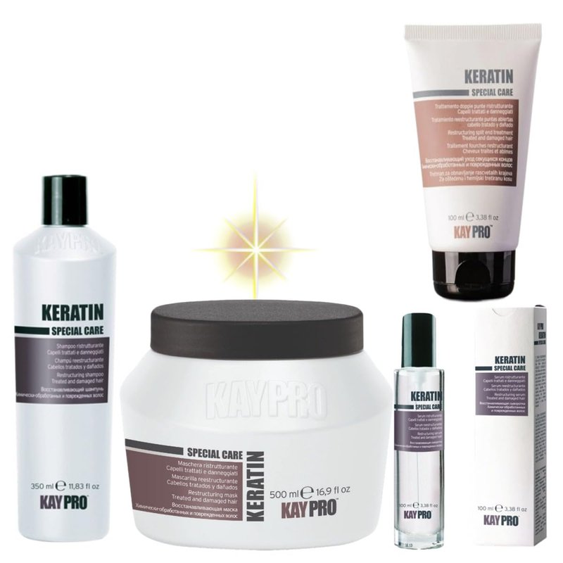 PROTEIN-BASED RESTRUCTURING ACTION TO RESTORE, MOISTURISE AND DEEPLY NOURISH THE HAIR .KayPro Restructuring SHAMPOO with KERATIN – 350 ml Restorative shampoo with keratin for treated and damaged hair. Effectively cleanses the hair, performing an in-depth restructuring, moisturising and nourishing action. Disciplines the hair, eliminates frizz and adds incredible sheen. .KayPro Restructuring MASK with KERATIN – 500 ml Restructuring mask with keratin for treated and damaged hair. Effectively detangles, eliminates frizz, provides instant softness, deep restructure. Returns brilliance and brightness, gives strength and tone. .KayPro Restructuring SERUM with KERATIN – 100 m KayPro restructuring serum with keratin for treated and damaged hair. Special smoothing action disciplines the hair, leaving it instantly glossy, soft and silky, without weightening it down. Envelopes the hair shaft in a film that protects from frizz and humidity, recompacting the cuticle and sealing split ends. Kaypro Keratin Special Care 100 m - Restructuring split ends treatment with keratin for treated and damaged hair - Repairs and prevents split ends without weighing down the hair - Makes hair more full-bodied, soft and bright .Restructuring split ends treatment with keratin for treated and damaged hair. Repairs and prevents split ends without weighing down the hair, adding extra body, softness and shine.